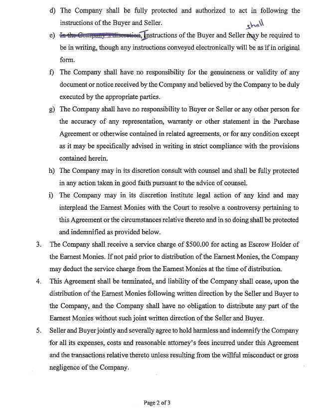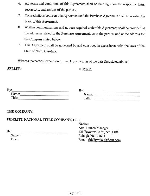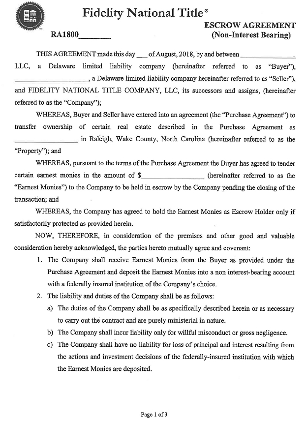 “Escrow Agent” shall mean Fidelity National Title Insurance Company, 421 Fayetteville Street, Suite 1304, Raleigh, North Carolina 27601.